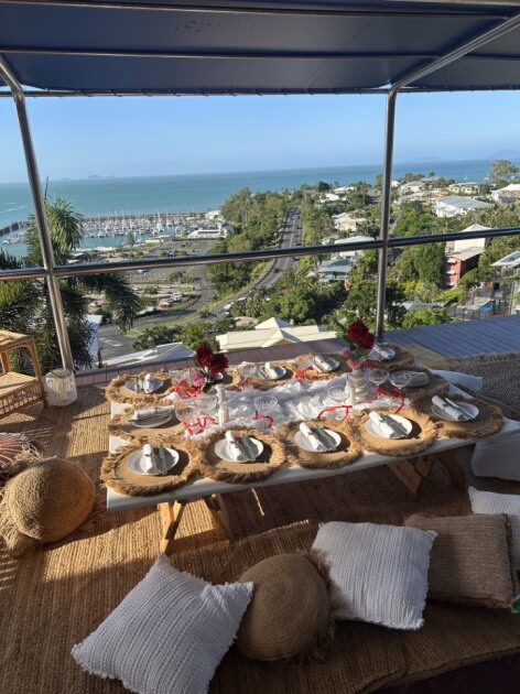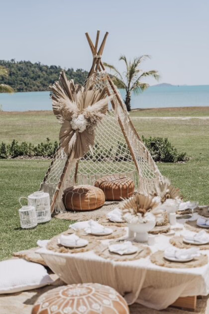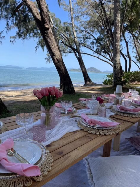 Arrive to a fully styled picnic featuring low dining tables, soft cushions, luxe rugs, fresh floral arrangements, and premium tableware—all thoughtfully designed to create a relaxed yet sophisticated atmosphere by the ocean. With the stunning Gold Coast skyline and rolling waves as your backdrop, it’s the perfect setting for photos, laughs, and laid-back celebration.